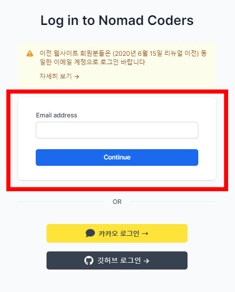 노마드 코더는 계정 로그인이 이메일로 인식이 되는듯 합니다.